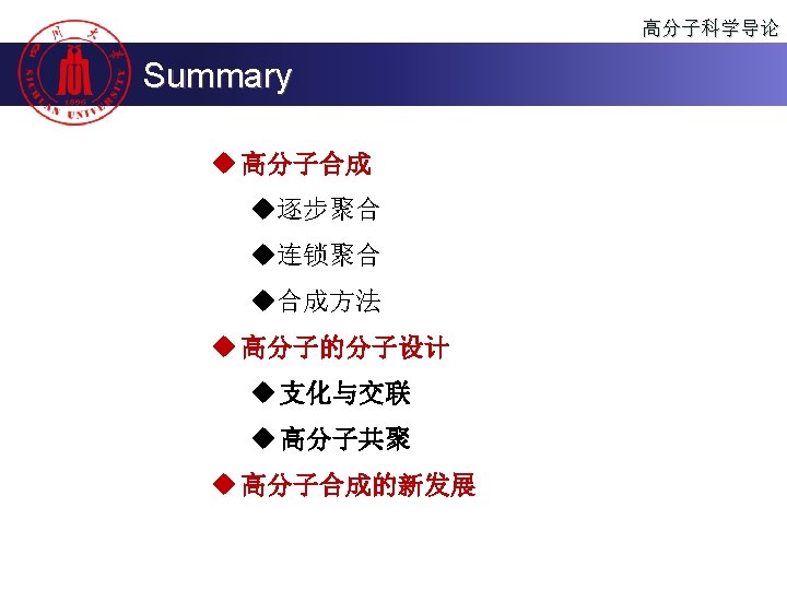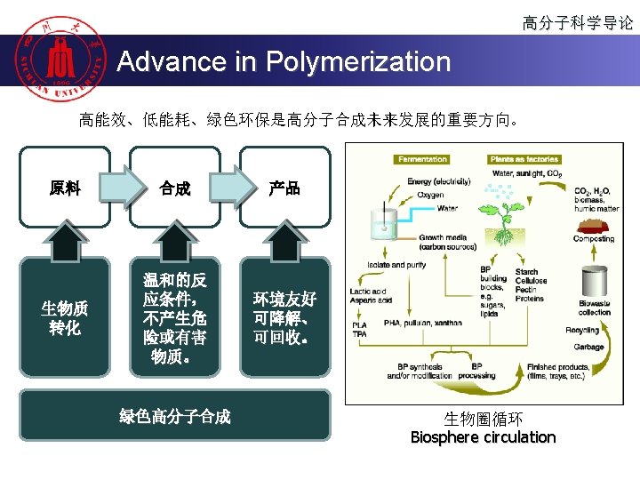 高分子科学导论 Content n 高分子的聚合方法 Polymerization n 聚合物的分子设计 Molecular design of the polymer n 聚合物的化学反应 Reactions of the Polymer n 高分子的老化、降解与回收 Polymer aging, degradation and recycling