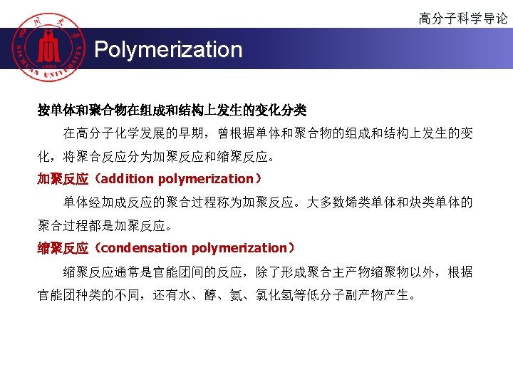 高分子科学导论 Introduction to polymer science 高分子的合成与化学性能 Polymer synthesis and chemical properties 第一讲 四川大学 化学学院