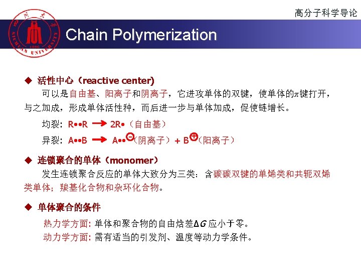 高分子科学导论 Chain Polymerization 烯类单体 u 自由基聚合 CH 2=CH 2 聚合类型 自由基 阴离子 阳离子 + + free radical polymerization CH 2=CH 2 CH 3 u 阳离子聚合 cationic polymerization u 阴离子聚合 anionic polymerization u 配位聚合 配位 + CH 2=CHCH=CH 2 + + ∆ + CH 2=C(CH 3)CH=CH 2 ∆ + CH 2=CHC 6 H 5 + ∆ ∆ ∆ CH 2=CHCl + CH 2=CCl 2 + CH 2=CHF + CH 2=CF 2 + coordination polymerization CH 2=CHOCOCH 3 CH 2=C(CH 3)COOCH 3 CH 2=CHCN ∆: available +: industrialized CH 2=CH-OR ∆ ∆ + + ∆ ∆ + ∆