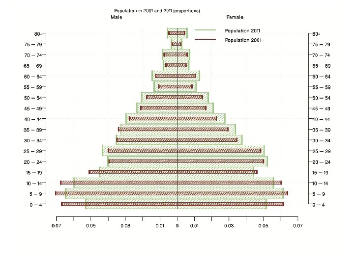 Population pyramid, Bangladesh census 2011 Male Female 80+ 75 - 79 70 - 74 65 - 69 60 - 64 55 - 59 Age group 50 - 54 45 - 49 40 - 44 35 - 39 30 - 34 25 - 29 20 - 24 15 - 19 10 - 14 5 -9 0 -4 7 6 5 4 3 2 1 0 1 Shares in population (%) 2 3 4 5 6 7