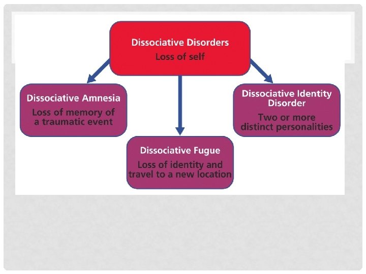 DISSOCIATIVE DISORDERS §disorders in which conscious awareness becomes separated (dissociated) from previous memories, thoughts and feelings. § sudden loss of memory or change in identity