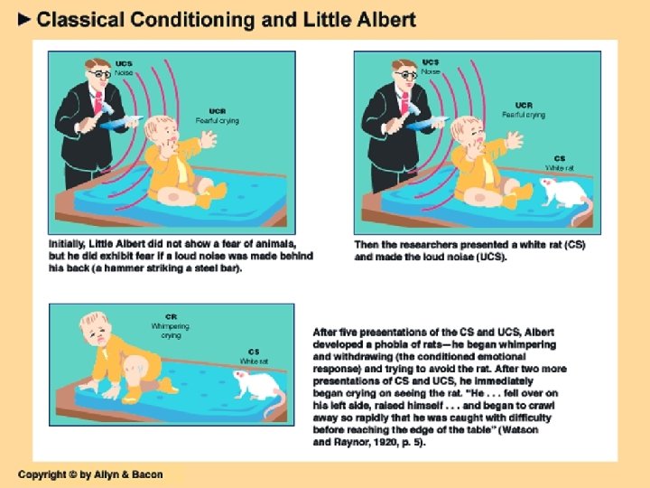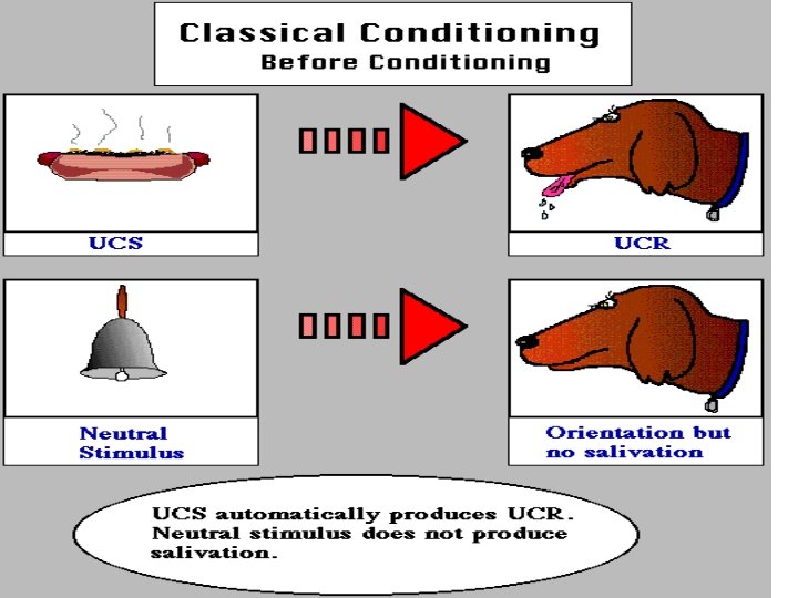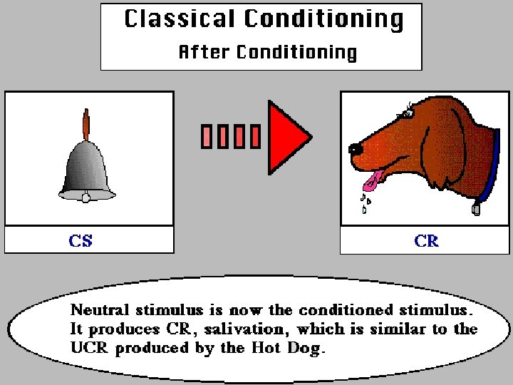 Pavlov’s Classical Conditioning Experiment § Conditioned Stimulus (CS) § originally irrelevant stimulus that, after association with an unconditioned stimulus, comes to trigger a conditioned response § Conditioned Response (CR) § learned response to a previously neutral conditioned stimulus