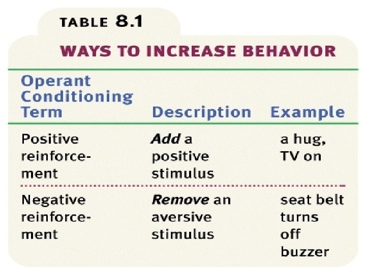 Reinforcer § Any event that strengthens the behavior it follows § Positive: it’s exisitence helps to create the desired behavior (food, drink etc) § Negative: it’s non-existence helps to create the desired behavior (loud noise, electric shock etc)