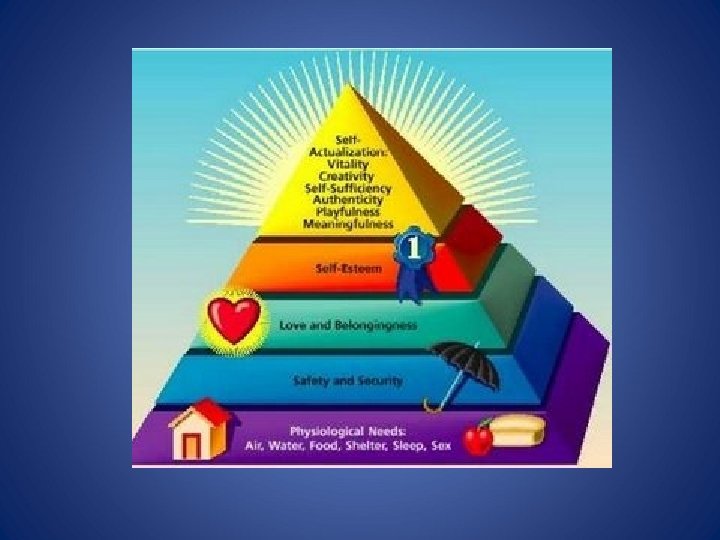 Humanistic (Important People and Beliefs) • Abraham Maslow: self-actualization is ultimate psychological need – Self-Actualization: All basic physical and psychological needs are met and self-esteem is achieved; motivated to achieve potential – Developed Maslow’s Hierarchy of Needs (lower on pyramid you are, the less free will you can exercise) Abraham Maslow