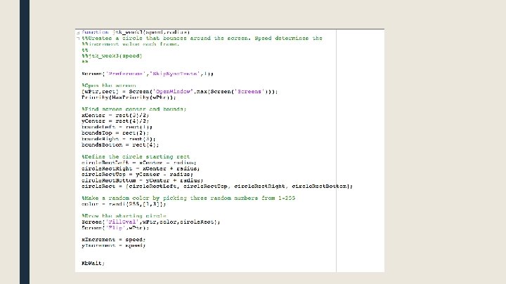 Using the Screen command ■ Opening the screen [window. Ptr, rect]=Screen('Open. Window', Screen. Number) returns a number that we will use to refer to this screen in future commands returns a rectangle (a vector of four numbers) that describe the dimensions of the screen which screen you want to open (you may have multiple monitors)