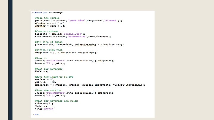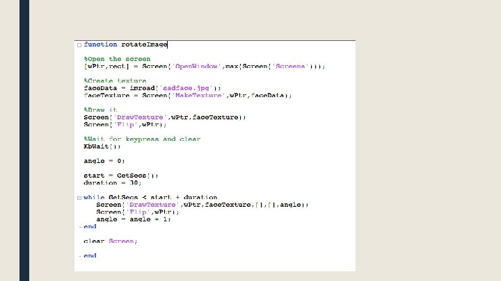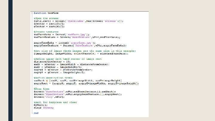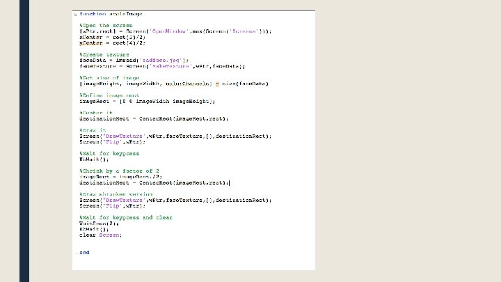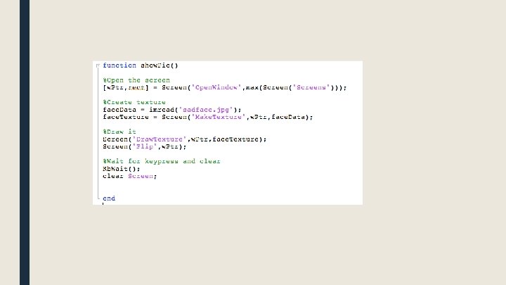 Displaying images >> face. Data = imread('sadface. jpg'); >> size(face. Data); ans = 650 506 3 >> face. Texture = Screen('Make. Texture', w. Ptr, face. Data); >> Screen('Draw. Texture', w. Ptr, face. Texture); >> Screen('Flip', w. Ptr);