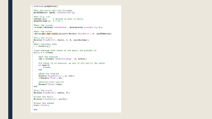 Using the screen Screen('Open. Window') do stuff with the screen clear Screen (or Screen('Close', w. Ptr)) NEW