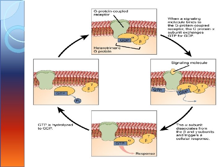 G-protein coupled receptors • When a ligand binds, the receptor changes conformation, allowing G-protein to be activated (GDP is exchanged for GTP) • G-protein dissociates from receptor then subunits from each other. Cell membrane a GTP g b