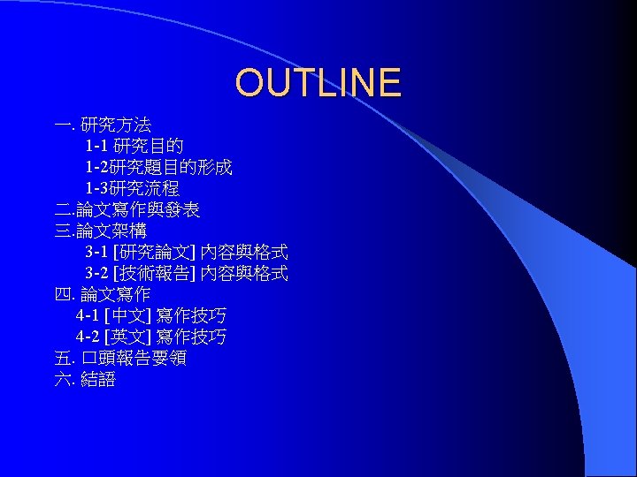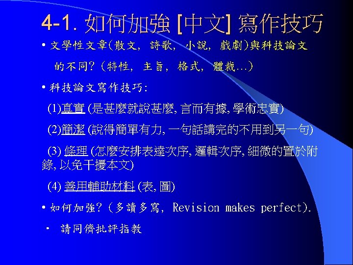 四、論文寫作 科技英文論文 l 篇章 (Essay, Chapter): (1) Priority(重要性) (2) Order(邏輯次序) l 段落(Section): (1) 由主題句(Topic Sentence)出發 (2) 一個段落一個主題(Single Topic in a sentence). l 句子(Sentence): (1) 儘量使用簡單句 (Simple sentences) (2) 有時使用複合句 (Compound sentences)