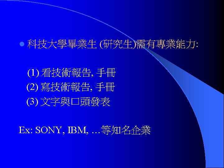 三. 論文架構 them what you want to tell them. (摘要, 前言) l Tell them. (本文主體) l Tell them what you have told them. (結語)