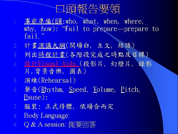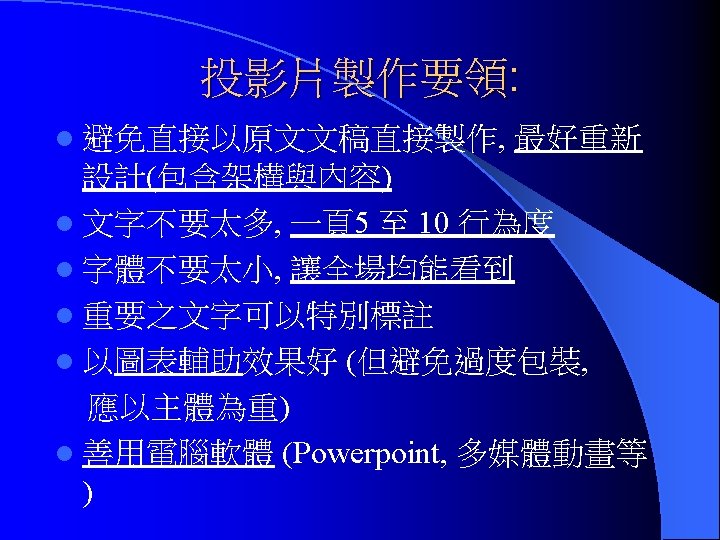 五、報告(Presentation)種類: 1. 書面報告 2. 口頭報告 (Documentation (Oral Presentation) 3. 海報展示 (Poster Presentation)
