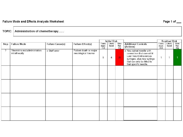 FMEA Steps… 1. 2. 3. 4. Select a process (topic) Assemble your team Describe the process steps Identify the ways in which each process step can fail (failure modes – e. g. drug maladministration; performing wrong site surgery; clinical mis-diagnosis; etc. ) 5. Identify the root cause(s) of failure (Why? ) 6. Identify the most likely effect(s) (i. e. consequence of failure) of each identified failure mode 7. Assess risk associated with each failure mode (consequence and likelihood – from risk matrix) 8. Identify additional controls required (actions to effect improvement) 9. Implement additional controls 10. Test process improvements