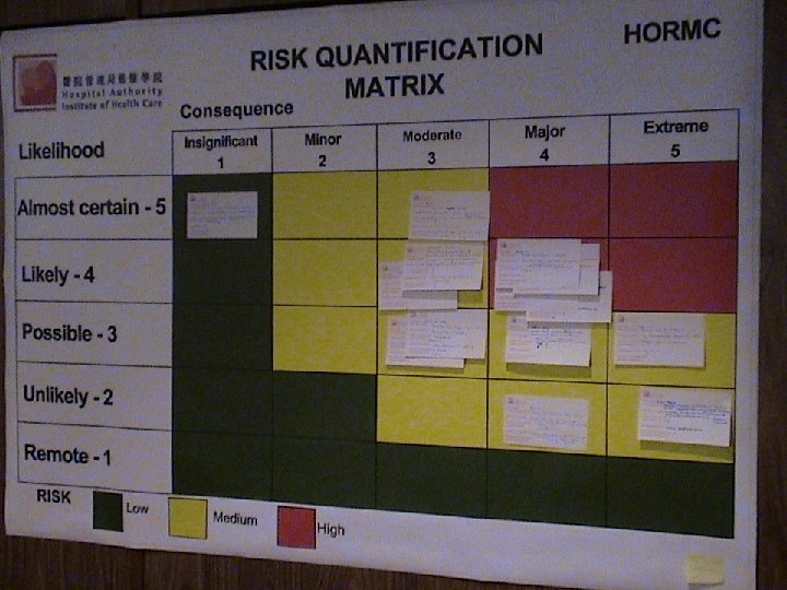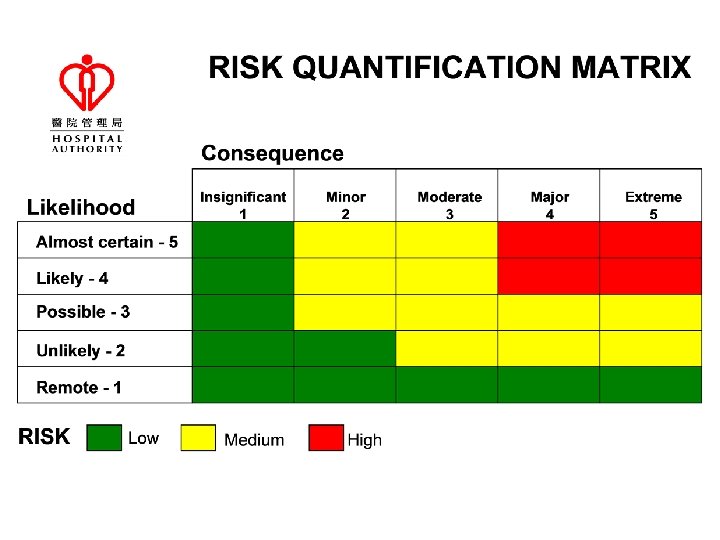 RISK QUANTIFICATION MATRIX Consequence Insignificant 1 Minor 2 Moderate 3 Major 4 Extreme 5 Almost certain - 5 5 10 15 20 25 Likely - 4 4 8 12 16 20 Possible - 3 3 6 9 12 15 Unlikely - 2 2 4 6 8 10 Remote - 1 1 2 3 4 5 Likelihood RISK Low Medium High