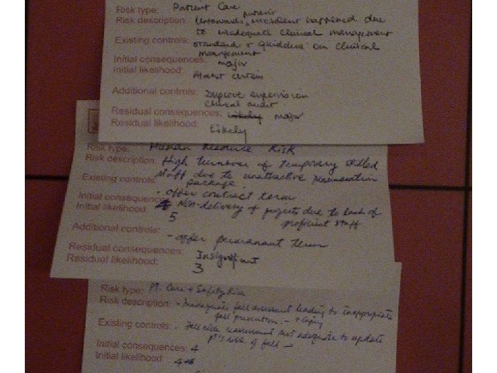 Some common sources of information used to populate a healthcare risk register REACTIVE Staff adverse incidents Complaints INTERNAL Other adverse incidents Root cause analyses Internal audits and inspections Patient Staff consultation General risk assessments Suggestion scheme Specialist risk assessments Claims Risk Register Hazard warnings Coroners reports Inquiry reports Safety alerts Incidents etc. occurring ‘elsewhere’ PROACTIVE Patient adverse incidents Accreditation standards Conferences, Seminars, etc. Facilitated workshops FMEA External audits, reviews etc. Benchmarking External stakeholder consultation EXTERNAL Books