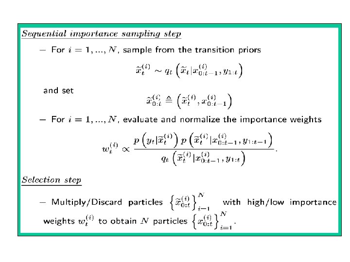 Sequential Monte Carlo • Sequential: – Real time processing – Dealing with non-stationarity – Not having to store the data • Goal: estimate the distrib of ‘hidden’ trajectories – We observe yt at each time t – We have a model: • Initial distribution: • Dynamic model: • Measurement model: