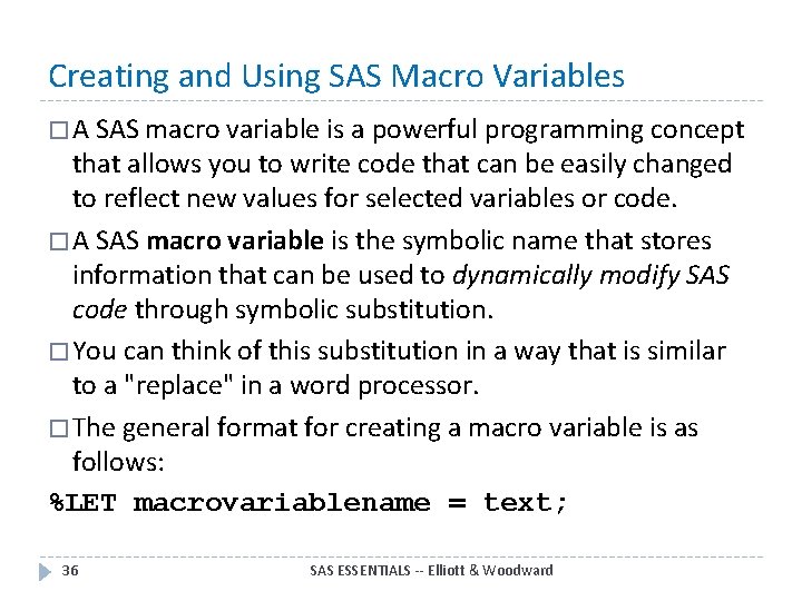 Creating and Using SAS Macro Variables � A SAS macro variable is a powerful programming concept that allows you to write code that can be easily changed to reflect new values for selected variables or code. � A SAS macro variable is the symbolic name that stores information that can be used to dynamically modify SAS code through symbolic substitution. � You can think of this substitution in a way that is similar to a "replace" in a word processor. � The general format for creating a macro variable is as follows: %LET macrovariablename = text; 36 SAS ESSENTIALS -- Elliott & Woodward