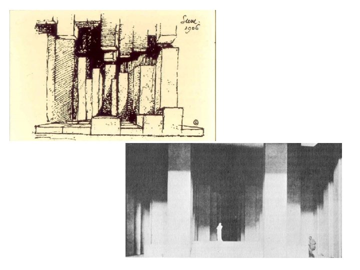 Adolphe Appia • Adolphe Appia, (1862 -1928) was a Swiss architect, stage designer and theorist of stage lighting and décor. His theories and realized works transformed the practice of stage design and he had a great influence on the development of performing arts • . His sets and his drawings didn’t look for pictorial realism, their intent was rather to create and underline a believable mood for each scene. Symbols and metaphors prevailed over literal descriptions, as in the representation of trees. The actors and the script were of equal importance than scenery: for Appia, the four basic scenic elements were: Painted Scenery (Vertical); Spatial Arrangement (Floor); the Actor; the Light. “Inclusion of the Actor as a scenic element creates a completely new focus with resonance in modenism”. Lucarelli, Fosco. http: //socks-studio. com/2013/12/13/a-revolution-in-stage-designdrawings-and-productions-of-adolphe-appia/