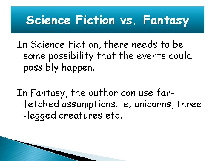 Science Fiction vs. Fantasy In Science Fiction, there needs to be some possibility that the events could possibly happen. In Fantasy, the author can use farfetched assumptions. ie; unicorns, three -legged creatures etc.