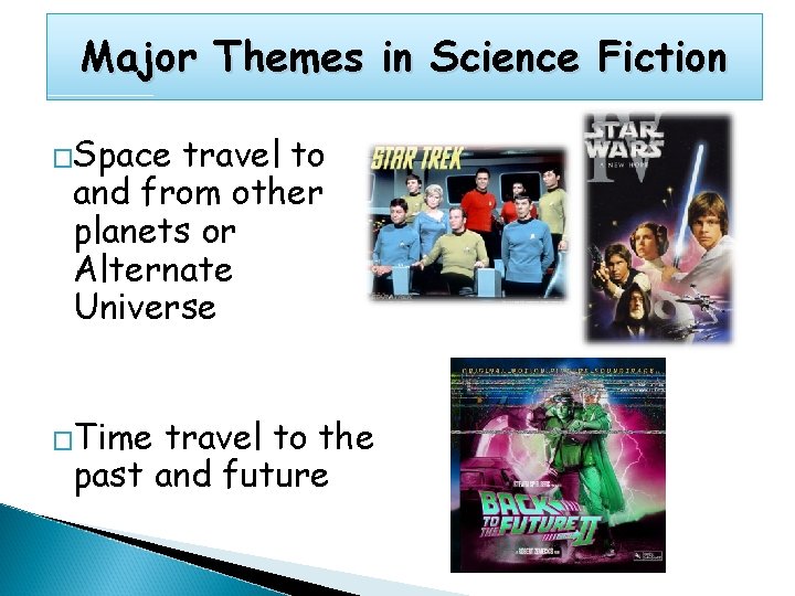 Major Themes in Science Fiction �Space travel to and from other planets or Alternate Universe �Time travel to the past and future