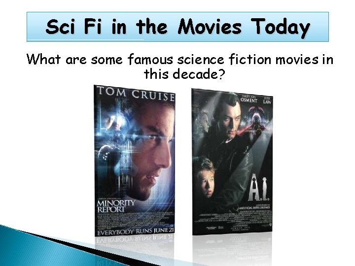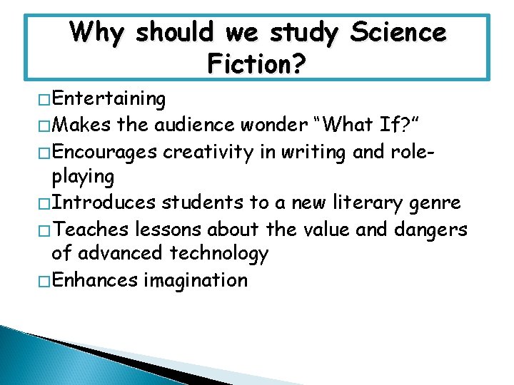 Why should we study Science Fiction? �Entertaining �Makes the audience wonder “What If? ” �Encourages creativity in writing and roleplaying �Introduces students to a new literary genre �Teaches lessons about the value and dangers of advanced technology �Enhances imagination