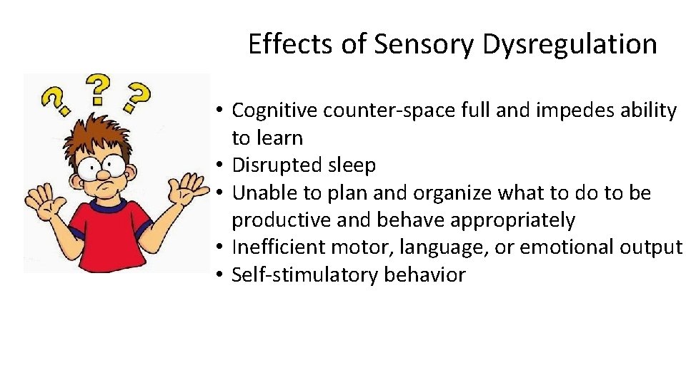 Effects of Sensory Dysregulation • Cognitive counter-space full and impedes ability to learn • Disrupted sleep • Unable to plan and organize what to do to be productive and behave appropriately • Inefficient motor, language, or emotional output • Self-stimulatory behavior