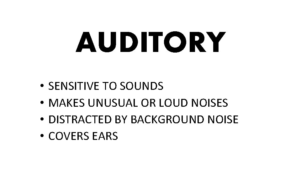 AUDITORY • • SENSITIVE TO SOUNDS MAKES UNUSUAL OR LOUD NOISES DISTRACTED BY BACKGROUND NOISE COVERS EARS
