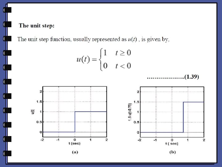 The unit impulse: • The unit impulse usually represented as δ (t) , also known as the dirac delta function, is given by, From equation (1. 38), it can be seen that the impulse exists only at t = 0 , such that its area is 1. This is a function which cannot be practically generated.