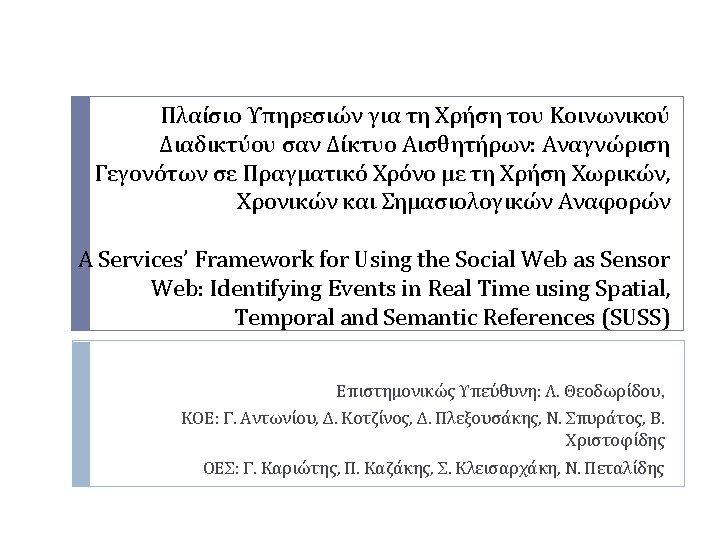 System Architecture � Presentation Layer � � Analytic & Application Layer � � User Interactive Interface Service Main Memory Stream Analysis Model Event Detection Service User Alert Service Data Layer Hellas. GI 2014, 11 – 12 December 2014
