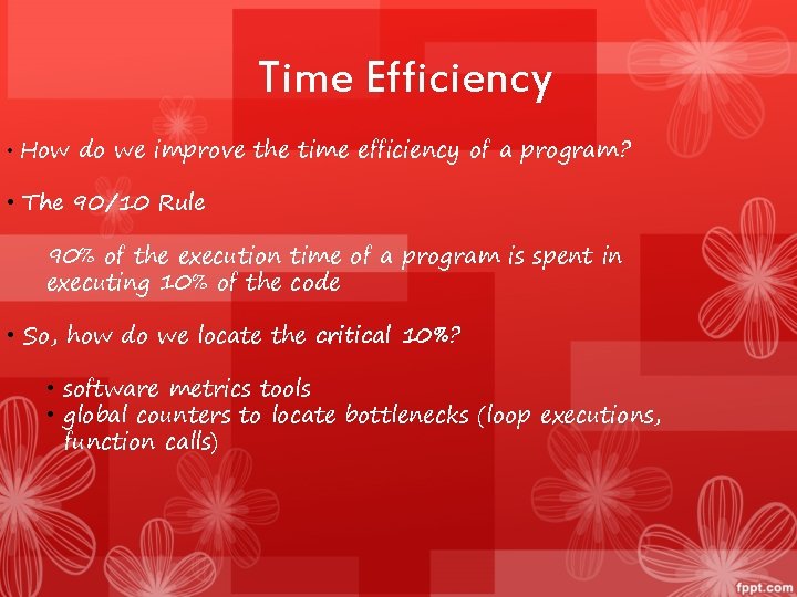 Time Efficiency • How do we improve the time efficiency of a program? • The 90/10 Rule 90% of the execution time of a program is spent in executing 10% of the code • So, how do we locate the critical 10%? • software metrics tools • global counters to locate bottlenecks (loop executions, function calls)