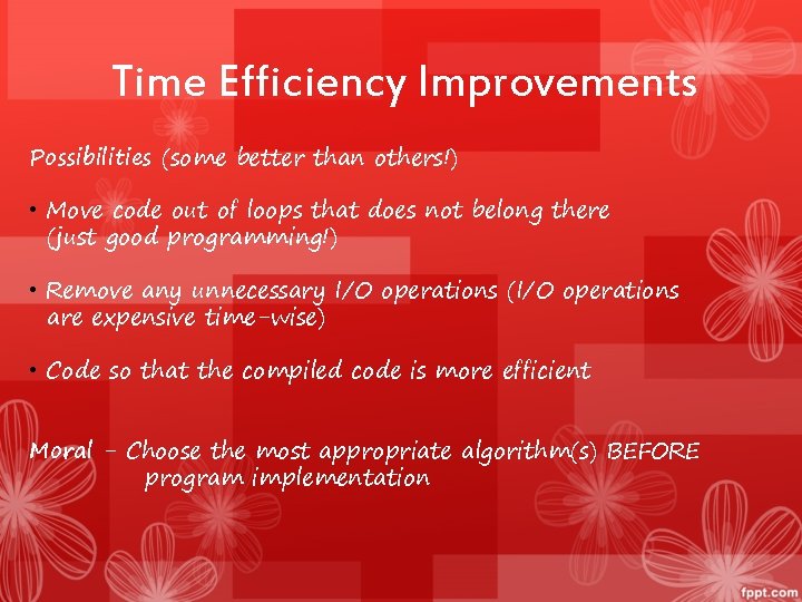 Time Efficiency Improvements Possibilities (some better than others!) • Move code out of loops that does not belong there (just good programming!) • Remove any unnecessary I/O operations (I/O operations are expensive time-wise) • Code so that the compiled code is more efficient Moral - Choose the most appropriate algorithm(s) BEFORE program implementation