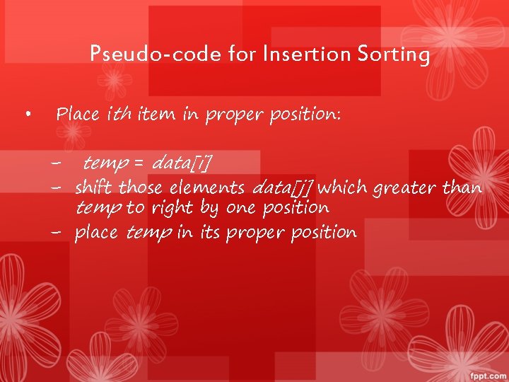 Pseudo-code for Insertion Sorting • Place ith item in proper position: – temp = data[i] – shift those elements data[j] which greater than temp to right by one position – place temp in its proper position