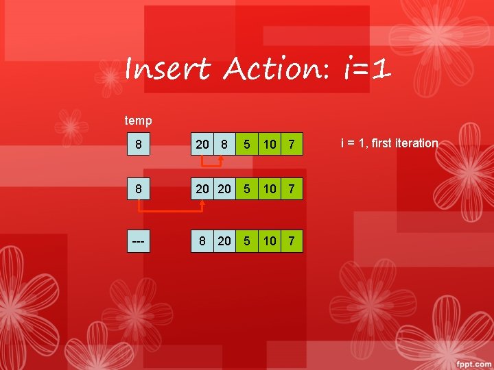 Insert Action: i=1 temp 8 20 8 5 10 7 8 20 20 5 10 7 --- 8 20 5 10 7 i = 1, first iteration