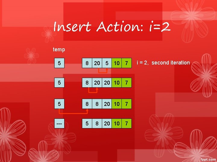 Insert Action: i=2 temp 5 8 20 5 10 7 5 8 20 20 10 7 5 8 8 20 10 7 --- 5 8 20 10 7 i = 2, second iteration