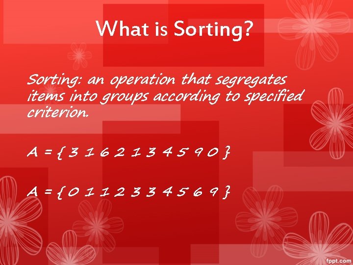 What is Sorting? Sorting: an operation that segregates items into groups according to specified criterion. A={3162134590} A={0112334569}