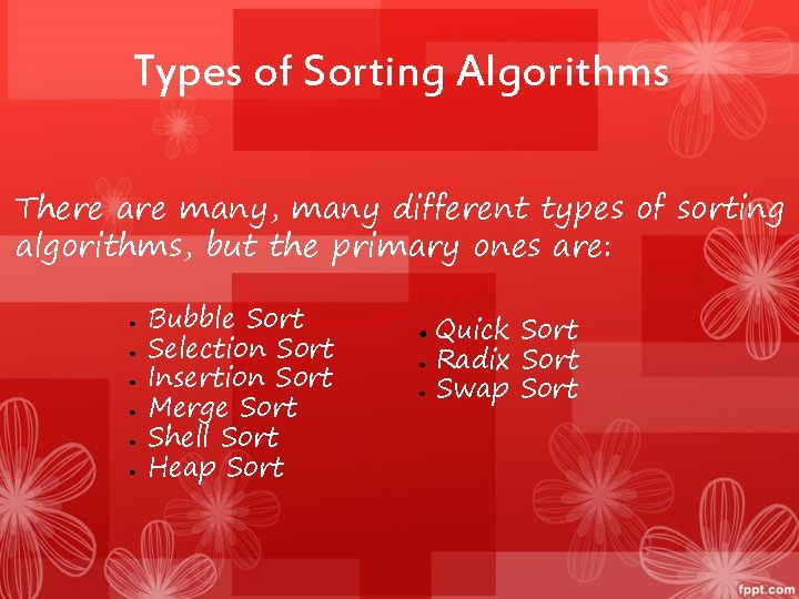 Types of Sorting Algorithms There are many, many different types of sorting algorithms, but the primary ones are: ● ● ● Bubble Sort Selection Sort Insertion Sort Merge Sort Shell Sort Heap Sort ● ● ● Quick Sort Radix Sort Swap Sort