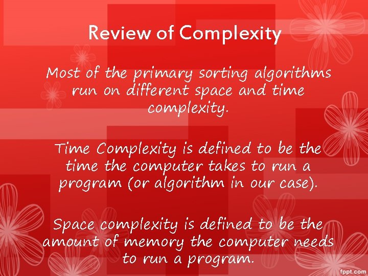 Review of Complexity Most of the primary sorting algorithms run on different space and time complexity. Time Complexity is defined to be the time the computer takes to run a program (or algorithm in our case). Space complexity is defined to be the amount of memory the computer needs to run a program.