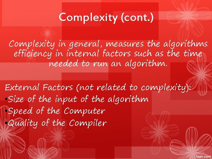 Complexity (cont. ) Complexity in general, measures the algorithms efficiency in internal factors such as the time needed to run an algorithm. External Factors (not related to complexity): • Size of the input of the algorithm • Speed of the Computer • Quality of the Compiler
