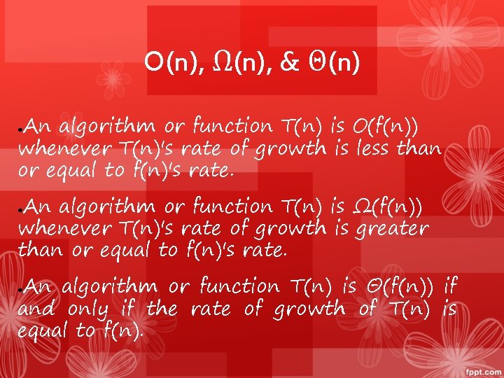 O(n), Ω(n), & Θ(n) An algorithm or function T(n) is O(f(n)) whenever T(n)'s rate of growth is less than or equal to f(n)'s rate. ● An algorithm or function T(n) is Ω(f(n)) whenever T(n)'s rate of growth is greater than or equal to f(n)'s rate. ● An algorithm or function T(n) is Θ(f(n)) if and only if the rate of growth of T(n) is equal to f(n). ●