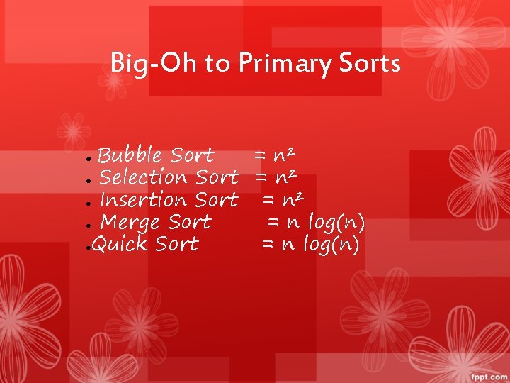 Big-Oh to Primary Sorts Bubble Sort = n² ● Selection Sort = n² ● Insertion Sort = n² ● Merge Sort = n log(n) ●Quick Sort = n log(n) ●