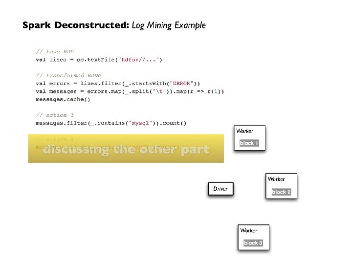 Resilient Distributed Datasets (RDDs) • Spark can persist / cache an RDD in memory across operations • Each slice is persisted in memory and reused in subsequent actions involving that RDD • Cache provides fault-tolerance: if partition is lost, it will be recomputed using transformations that created it