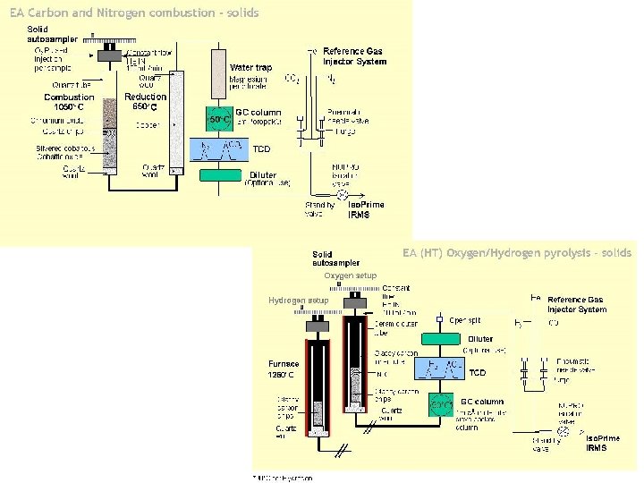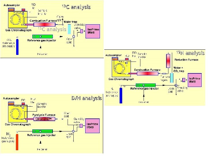 Dual Inlet sample and reference analyzed alternately 6 to 10 x viscous flow through capillary change-over valve 1 to 100 μmole of gas required highest precision Continuous Flow sample injected into He stream cleanup and separation by GC high pumping rate 1 to 100 nanomoles gas reference gas not regularly altered with samples loss of precision