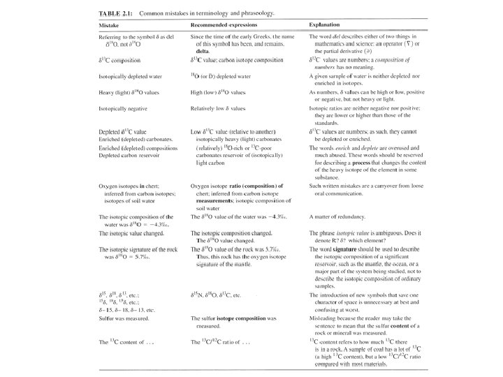 Since natural variations in isotope ratios are small, we use δ notation δHX = ((Rsample/Rstandard) -1) x 1000 where R = heavy/light isotope ratio for element X and units are parts per thousand (or per mil, ‰) e. g. δ 18 O (spoken “delta O 18) or δ 34 S (spoken “delta S 34) Don’t ever say “del”. Don’t ever say “parts per mil”. It makes you sound like a knuckle-head.