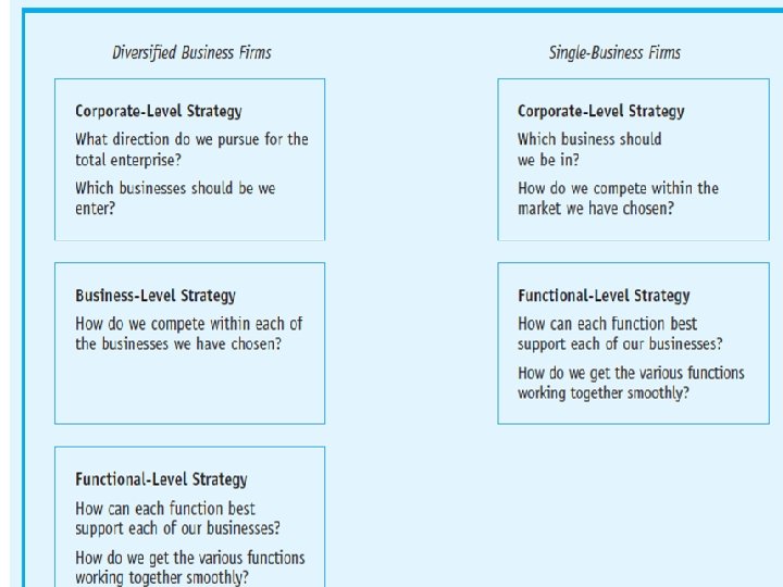 Levels of strategy 1. Corporate level: concerned with the overall purpose and scope of an organisation and how value will be added to the different parts (business units) of the organisation 2. Business unit level: how does an organization approach a particular product or market? 3. Functional or departmental level: It is the level of the operating divisions and departments.
