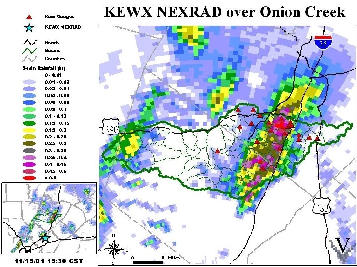 RADAR Rainfall Estimates NEXRAD provides real-time data on a ~16 km 2 (6 mi 2) grid Equivalent to about 21 rain gages in Brays Bayou watershed Each estimate represents an average rainfall amount over the entire 4 x 4 km 2 area NEXRAD rainfall estimates compare well with point rain gage measurements (r 2 ~ 0. 9)