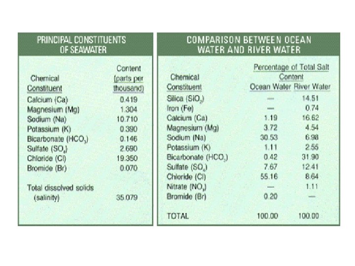 Seawater: What is it composed of? • Dissolved solids from weathering rocks / erosion • Chemicals released from underwater & above ground volcanoes or decay of marine organisms • 85% of the solids are Sodium and Chloride (salt)