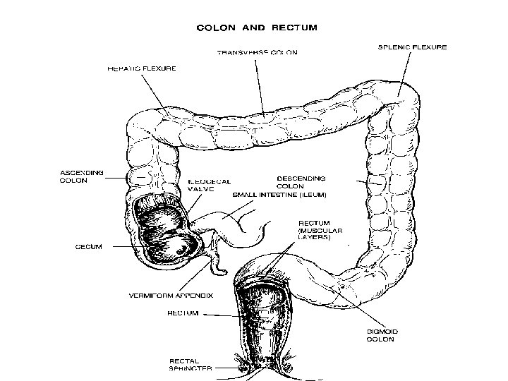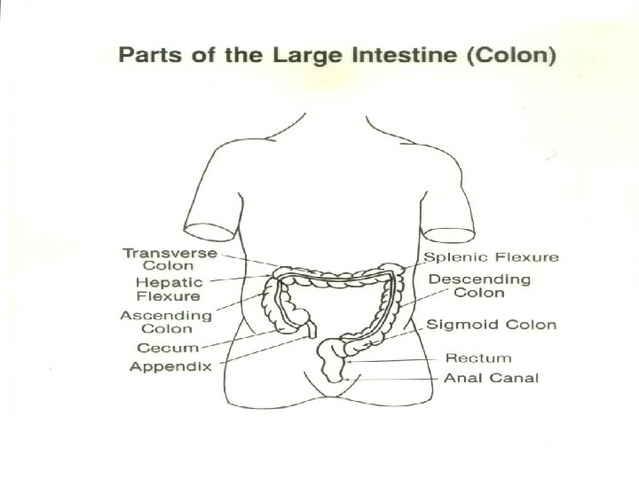 Mechanical and Chemical Digestion n n n Large intestine Parts of: Ascending, transverse, descending, sigmoid, rectum Functions: Absorption of water, electrolytes, proteins into amino acids, and bacterial products Feces formation Food in large intestine 3 -10 hours for absorption purposes Undigested food is expelled via “mass peristaltic movement” out the anus