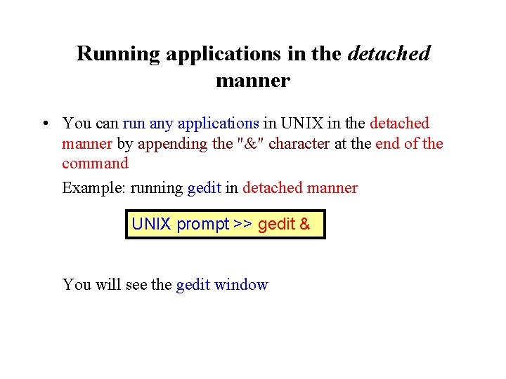 Running applications in the detached manner • You can run any applications in UNIX in the detached manner by appending the "&" character at the end of the command Example: running gedit in detached manner UNIX prompt >> gedit & You will see the gedit window