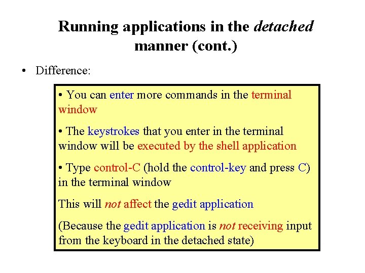 Running applications in the detached manner (cont. ) • Difference: • You can enter more commands in the terminal window • The keystrokes that you enter in the terminal window will be executed by the shell application • Type control-C (hold the control-key and press C) in the terminal window This will not affect the gedit application (Because the gedit application is not receiving input from the keyboard in the detached state)