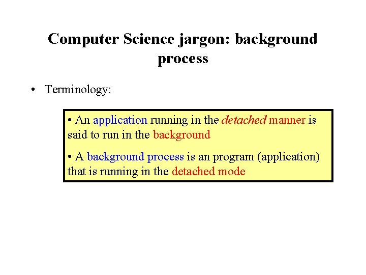 Computer Science jargon: background process • Terminology: • An application running in the detached manner is said to run in the background • A background process is an program (application) that is running in the detached mode
