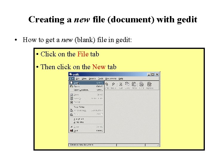 Creating a new file (document) with gedit • How to get a new (blank) file in gedit: • Click on the File tab • Then click on the New tab